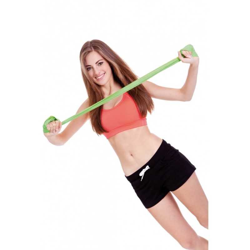 La bande en latex vert, de résistance moyenne et d'une longueur de 1,20 m, offre une solution efficace pour le travail des principaux groupes musculaires, incluant les bras, le dos, les fessiers, le buste, les épaules et les abdominaux.