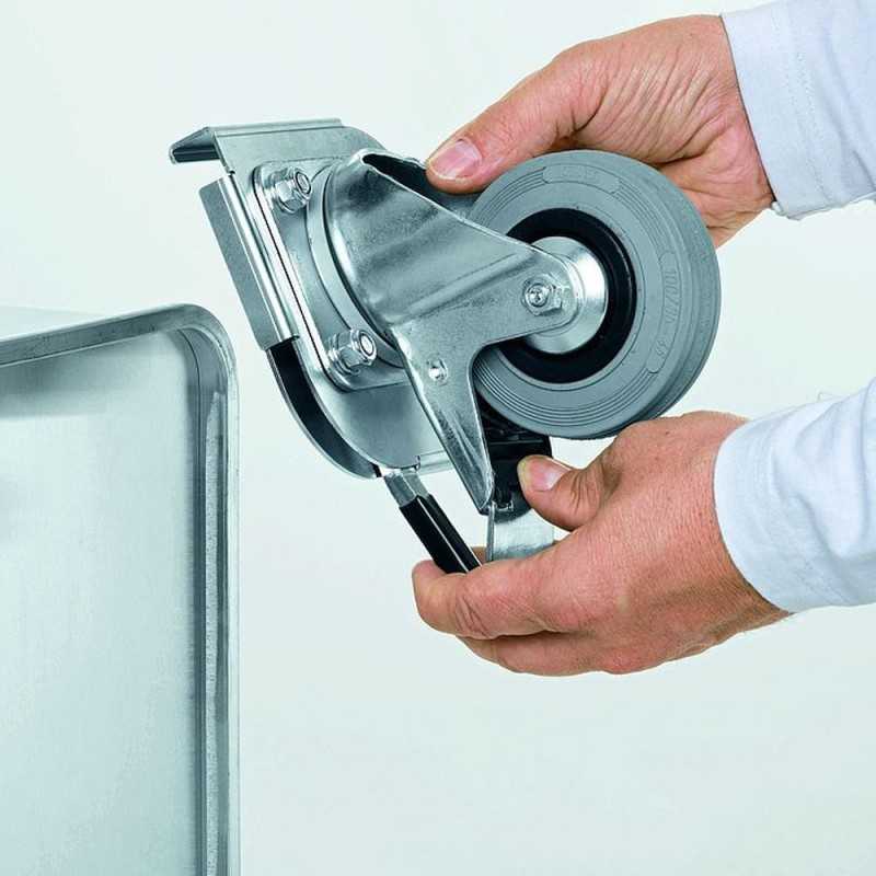 Les roulettes amovibles Zarges transforment toutes les caisses K470, en quelques gestes et sans le moindre outil en caisses roulantes.