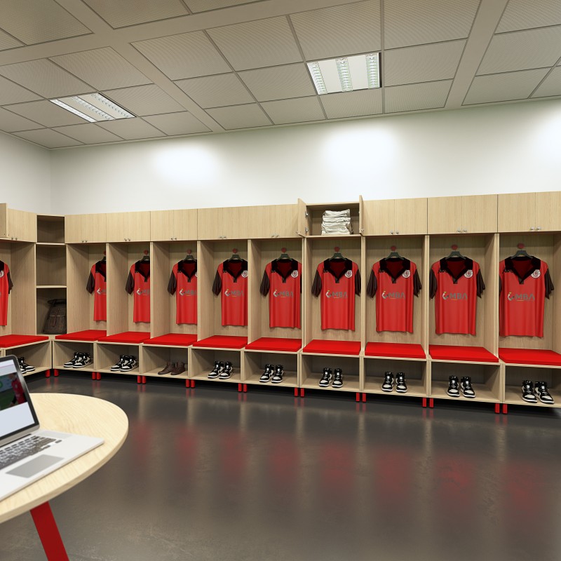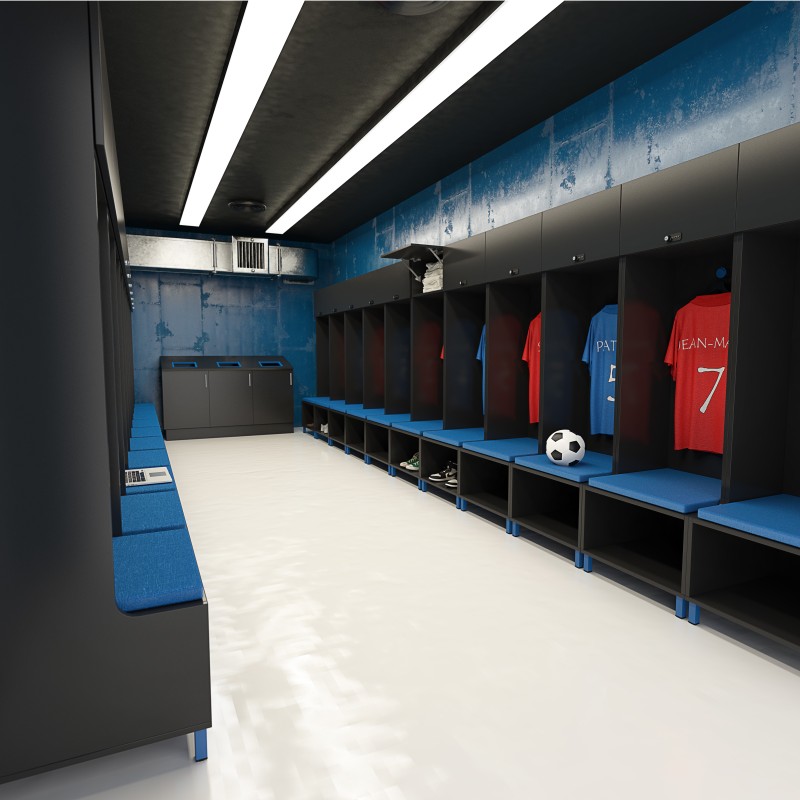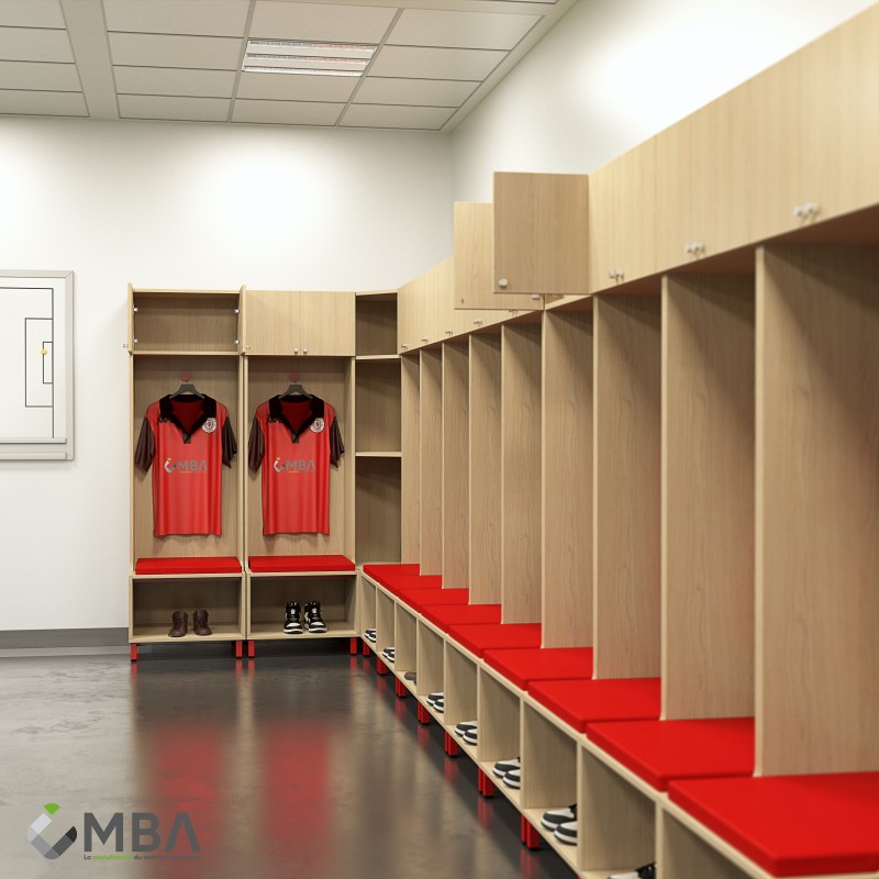 Confort d'assise : Le vestiaire est équipé d'une assise ergonomique, parfaite pour le confort du joueur, permettant de se changer et se préparer dans les meilleures conditions.