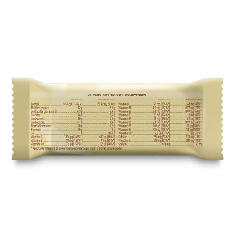 Concentré de protéines de lait, sirop d’oligofructose, couverture de chocolat au lait (sucre, beurre de cacao, lait écrémé en poudre, pâte de cacao, protéines de lactosérum (lait), beurre anhydre (lait), lait en poudre, émulsifiant : lécithine de soja, arôme, arôme naturel de vanille), agent d’enrobage : sirop de polydextrose, édulcorant : sirop de sorbitol, beurre de cacao, huile de tournesol, minéraux : citrate de sodium - phosphate de calcium - phosphate de sodium, vitamines : C (acide L-ascorbique) - E (acétate de DL-alpha-tocophéryle) - B3 (nicotinamide) - B5 (D-pantothénate de calcium) - A (acétate de rétinyle) - D (cholécalciférol) - B6 (chlorhydrate de pyridoxine) - B2 (ribofl avine) - B1 (chlorhydrate de thiamine) - B9 (acide ptéroylmonoglutamique) - B8 (D-biotine) - B12 (cyanocobalamine), L-cystine, arôme, exhausteur de goût : chlorure de potassium, agent de charge : cellulose.