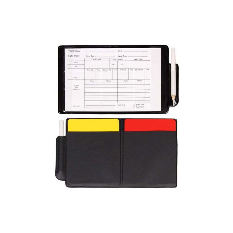 Designed to provide referees with efficiency and organization, this complete kit includes everything they need to officiate a match with peace of mind. It includes a set of yellow and red cards, a pencil and a notebook for recording important actions during the match. The vinyl pouch (11 × 10 cm) provides practical, secure storage, while the 10 × 8 cm cards ensure excellent visibility on the pitch.