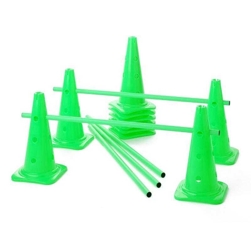 Elevate your soccer training with this green kit. Its simple design lets you easily create obstacles for a variety of crucial exercises. These obstacles are essential for developing coordination, speed, changes of pace and jumping skills.