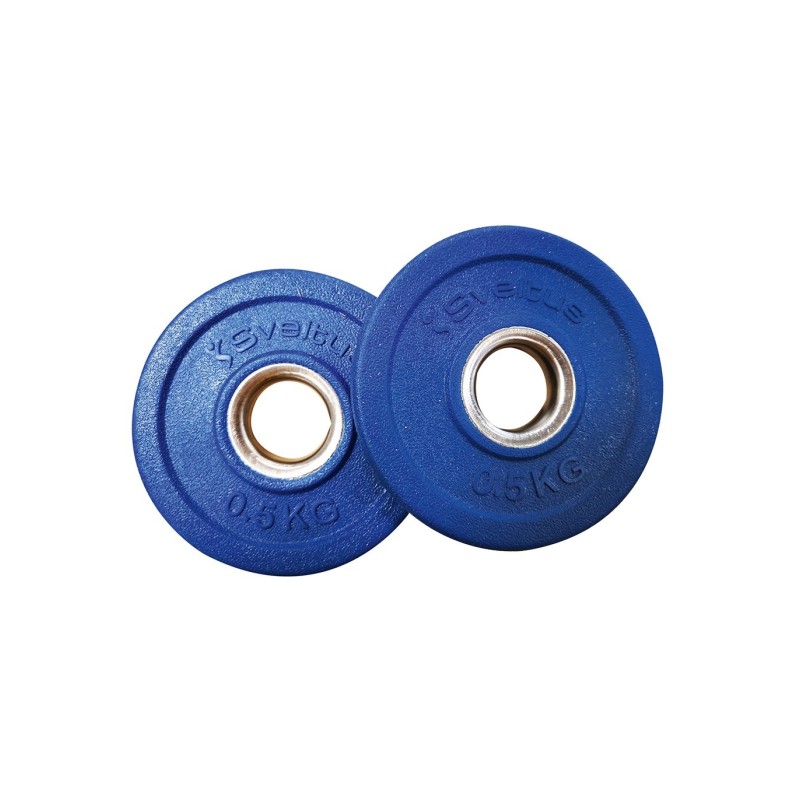 The rubber discs with steel rings are distributed as follows: 2 discs weighing 500 g, 2 discs weighing 1 kg and 2 discs weighing 2 kg.