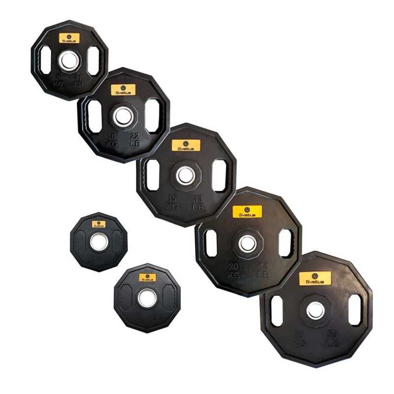 Compatible with all 50 mm diameter Olympic bars, these discs are ideal for regular use. Models with handles offer additional versatility, allowing easy handling and a greater variety of exercises.