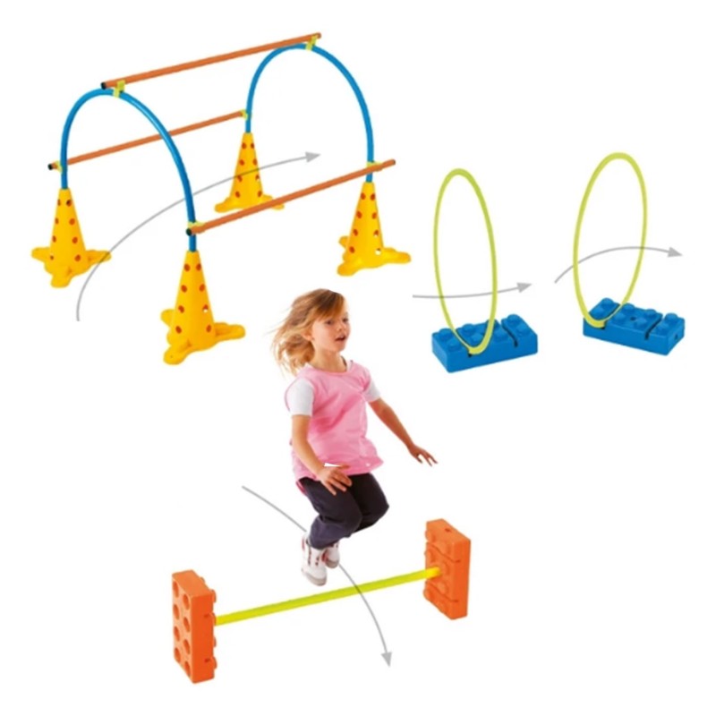 Il comprend 4 cônes, 4 briques, 2 demi-cerceaux de 70 cm, 3 jalons de 1 m, 1 jalon de 80 cm, 3 paires de pinces jalon et 2 cerceaux plats de 50 cm, offrant une grande variété de configurations pour adapter les exercices à l’âge et au niveau des enfants.