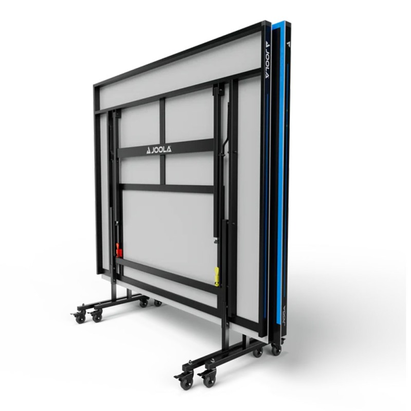 Les huit roulettes de transport (Ø 5 cm) permettent de déplacer facilement la table selon vos besoins et de la sécuriser grâce au système de blocage, garantissant stabilité et sécurité lors des matchs. La fonction solo play permet de relever une moitié de la table pour un entraînement individuel, tandis que les pieds réglables assurent une surface plane, même sur un terrain irrégulier.
