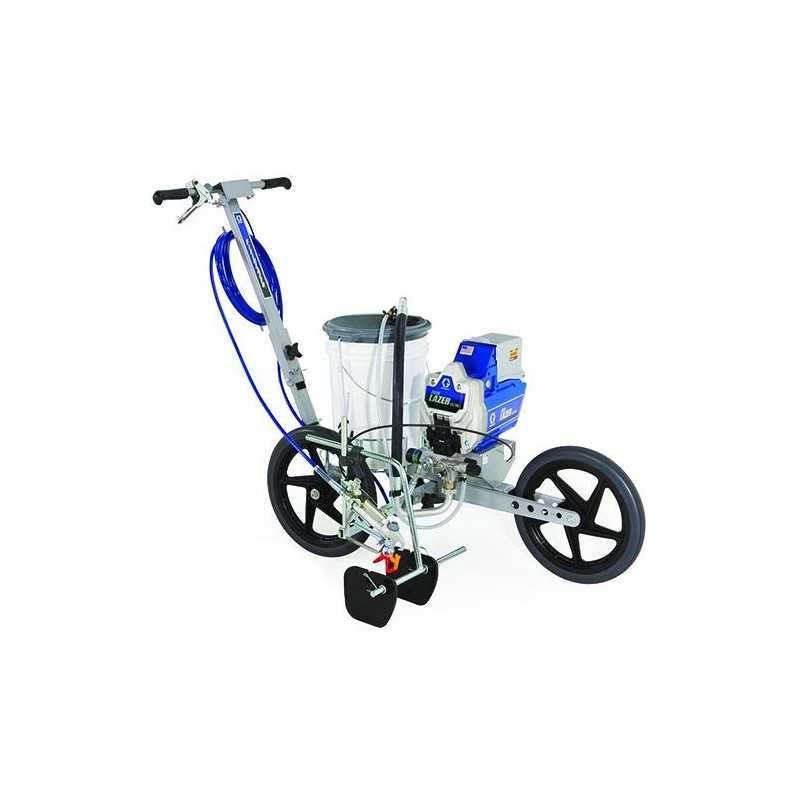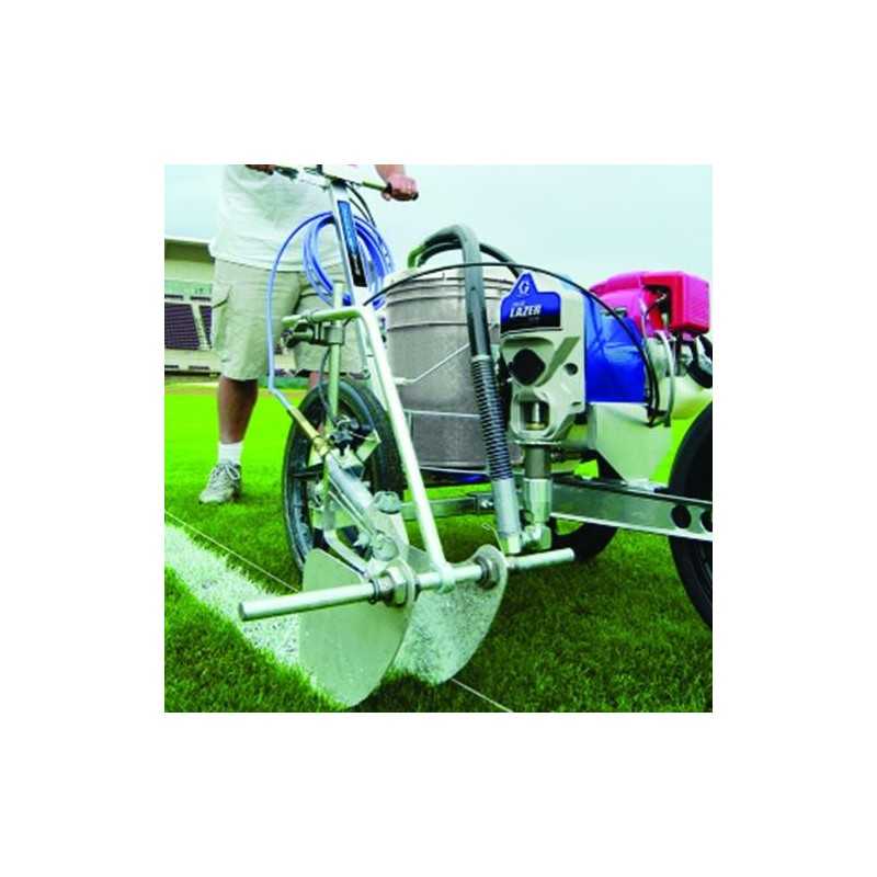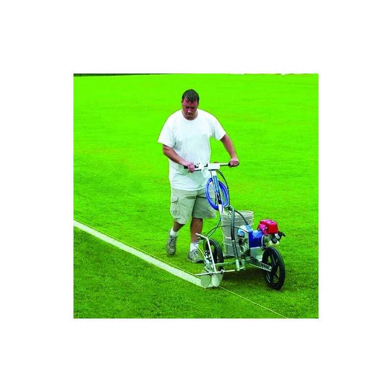 Fabriquée en acier galvanisé et peinture époxy, la traceuse est dotée d'une cuve de 30 litres avec couvercle inclus. Son poids de 26 kg, associé au guidon rabattable, facilite le rangement. Les 3 roues en mousse de grand diamètre et le concept léger assurent des bandes plus uniformes avec moins de fatigue pour l'opérateur.