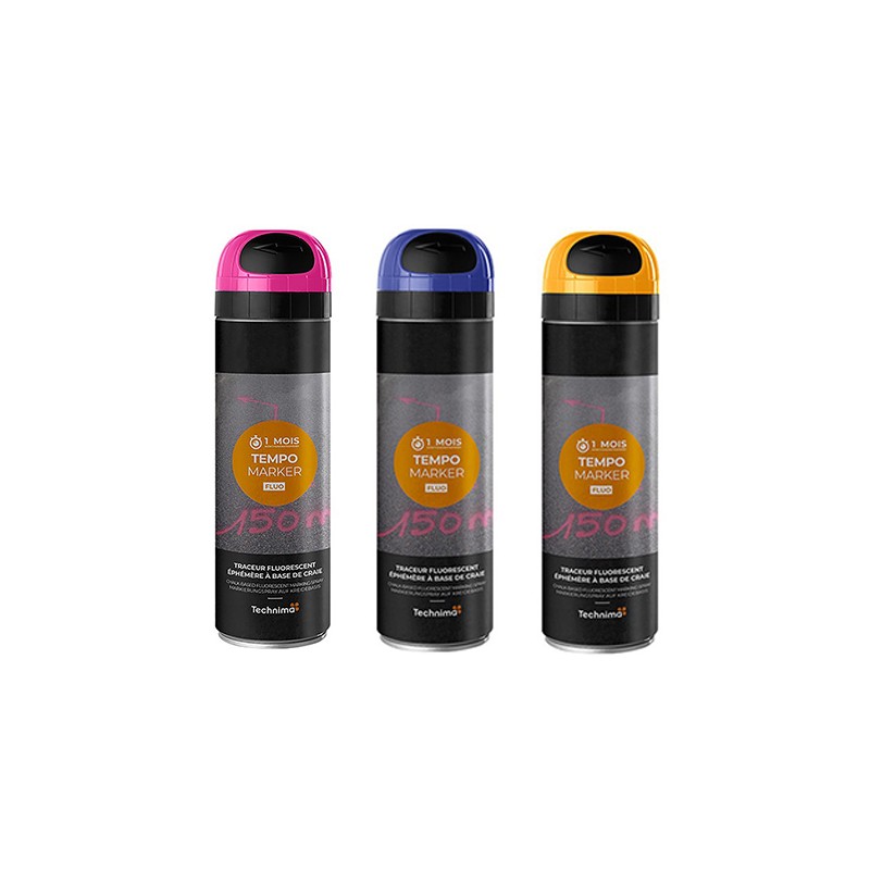 Disponible en plusieurs couleurs vives (comme bleu, rose ou orange), il garantit une excellente visibilité même à distance. Son format aérosol permet une application rapide et précise, idéale pour tracer des repères clairs et professionnels en quelques secondes.